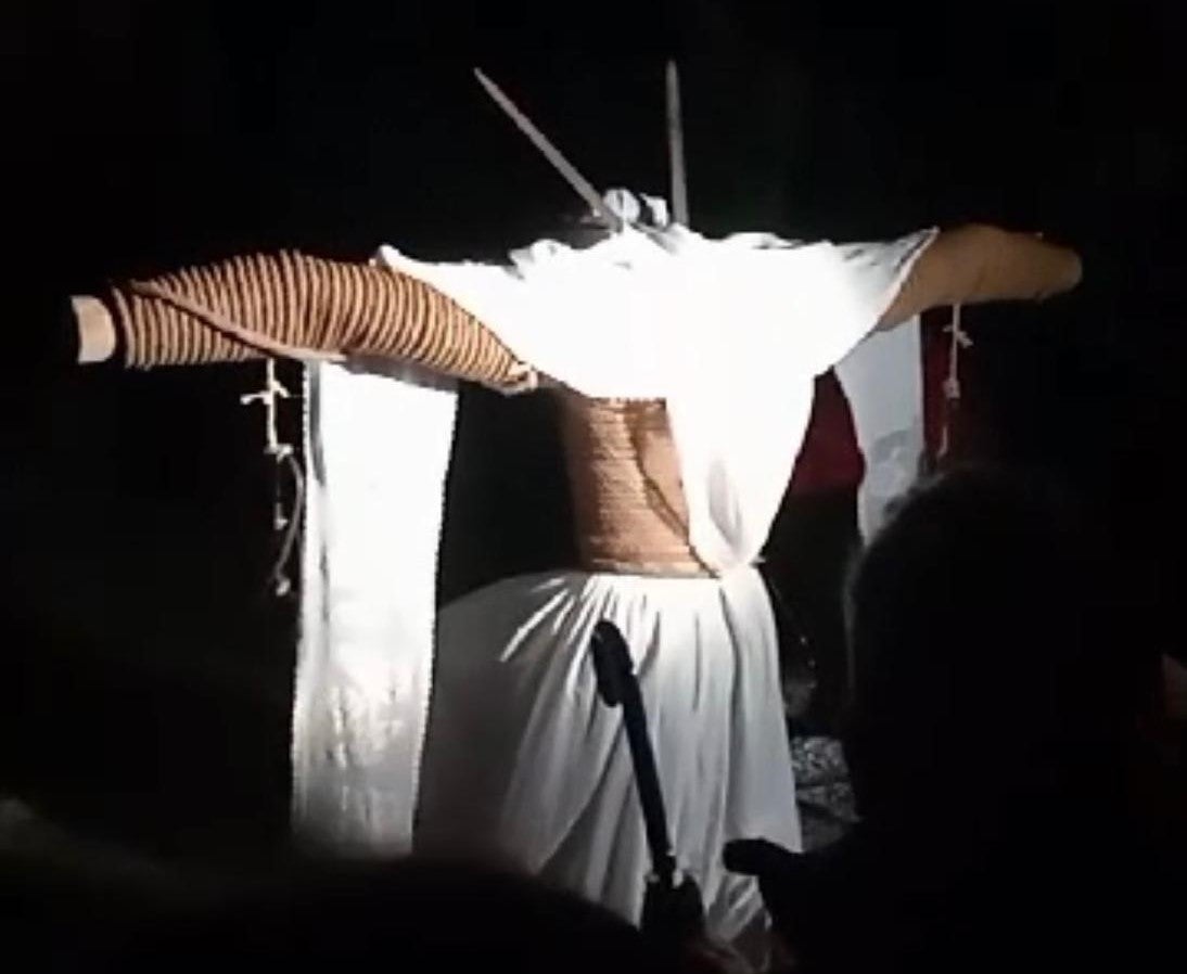 Una enagua blanca le cubre de cintura para abajo y de la mitad de sus brazos penden un par de vilortas, con tres aros cada una, y una toga, símbolo del Crucificado. Un velo blanco que sujeta con una corona de espinas cubre su rostro, sobresaliendo por encima de la cabeza dos espadas cruzadas. Todo ello colocado previamente de una manera exquisita, siguiendo otro ritual.