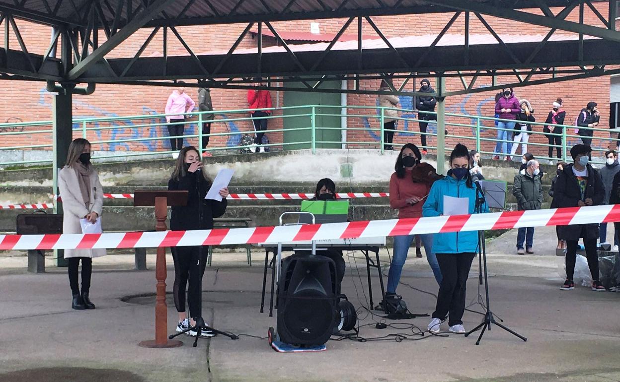Además de las actividades que, desde el Departamento de Orientación, se han propuesto a los docentes para hacer llegar un mensaje de paz desde primera hora, a partir de las 11:15 h. se sucedieron una serie de actos, empezando por la lectura de un manifiesto a cargo de las alumnas Marta de Matías y Leire Gil.