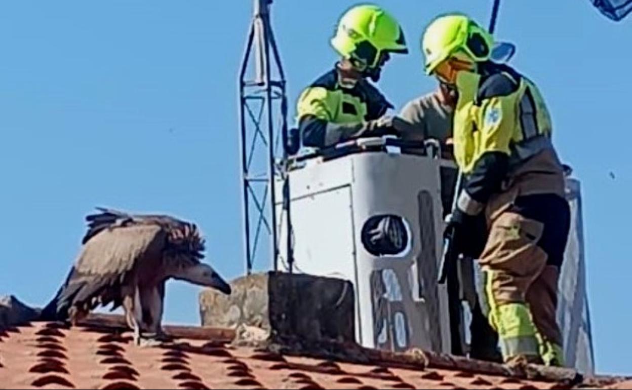 Los bomberos rescatan a un buitre de un tejado en Navalmoral