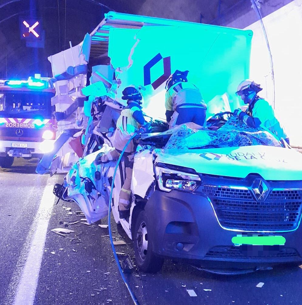 Los bomberos del SEPEI rescatan al conductor de un camión que volcó en los túneles de Miravete