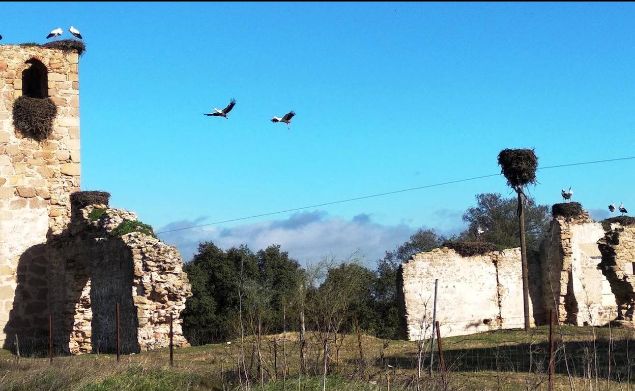 Desde los hace ya más de treinta años que las vimos por primera vez, estas ruinas siempre han atraído nuestra atención, siendo un punto de visita habitual en cuanto hemos tenido ocasión. Por un lado, por la historia que albergan tanto el recinto como el paraje, cuna de la comarca y de la organización política mancomunal e igualitaria de la misma y, por otro, por la auténtica gozada que supone la contemplación de esa cada vez más nutrida población de cigüeñas que allí regresan invierno tras invierno llamadas por el benigno clima de las tierras arañuelas. Un espectáculo natural que a mi mujer, Yolanda, y a mi nos ilumina el ánimo cada vez que tenemos la fortuna de disfrutarlo.