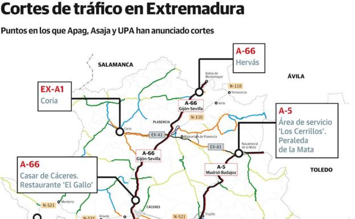 Ángel García Blanco, presidente de Asaja Cáceres, vaticina que el martes será complicado circular por la región, en puntos con habitualmente alta densidad de tráfico, por los cortes autorizados de doce carreteras. Entre ellas, dos autovías nacionales, una autonómica y cuatro nacionales. El campo, de esta forma, traslada su crisis a unas vías que sufrirán cortes entre las 10,00 h. y las 15,00 h.