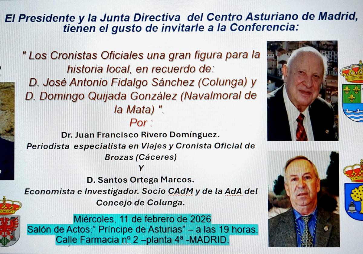 'Los Cronistas Oficiales, una gran figura para la historia local' es el título de la conferencia que se celebrará desde las siete en el salón de actos del centro, en recuerdo de Domingo Quijada y de José Antonio Fidalgo, que ostentó ese cargo en el Ayuntamiento asturiano de Colunga.