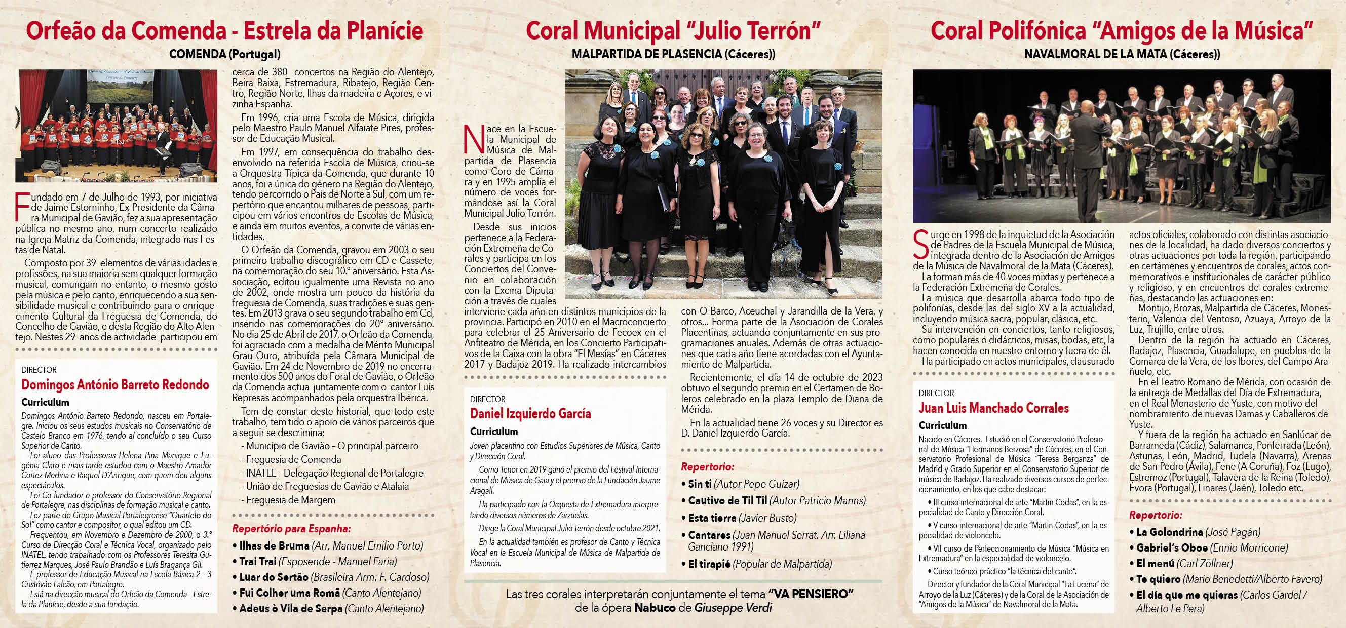 El cartel del encuentro lo completan la coral Orfeao da Comenda-Estrela da Planície, de Portugal, y la coral municipal 'Julio Terrón', de Malpartida de Plasencia.