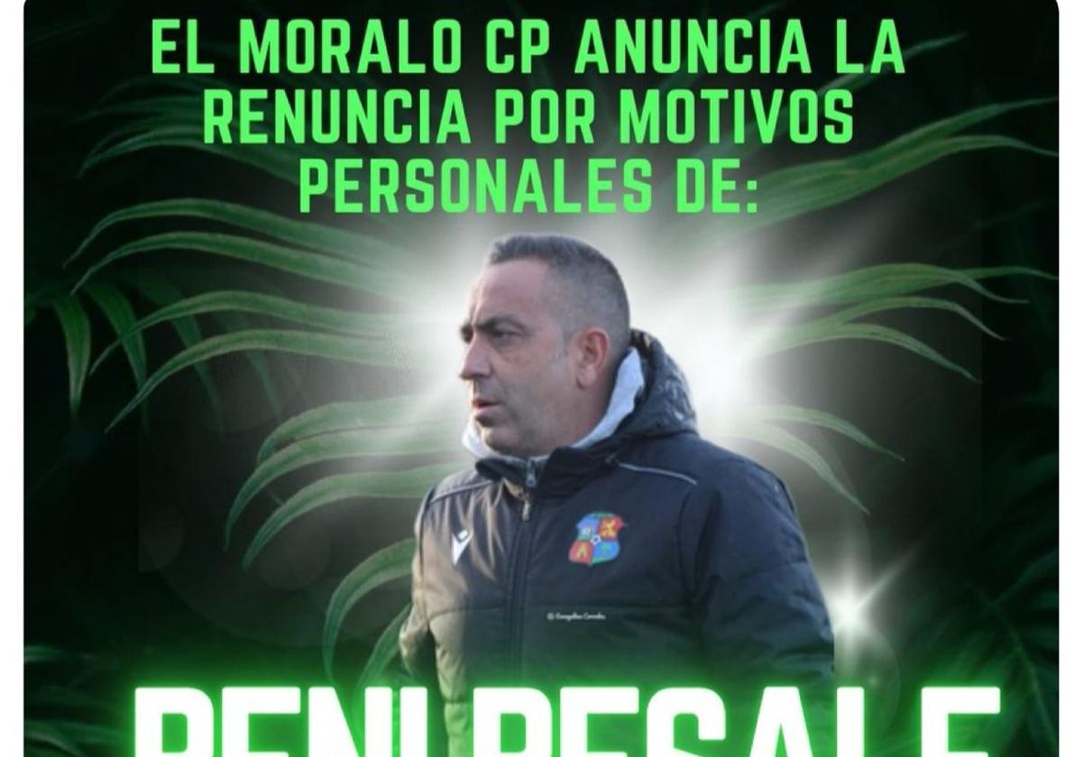 en la mañana del jueves en sus redes sociales la renuncia de quien ha sido su entrenador desde la anterior temporada, Benito Pineda, Beni Besale, por motivos personales. «El Moralo CP y Benito Pineda separan sus caminos, te estaremos siempre agradecidos a tu gran labor por el club», se dice en esa comunicación.