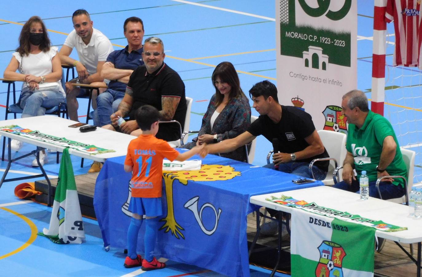 Óliver Torres, futbolista moralo que pertenece al Sevilla, fue recibido de manera muy calurosa en la noche del miércoles en el pabellón Antonio Jara, en un encuentro con los chavales de la cantera local que ha abierto los actos del centenario del Moralo CP.