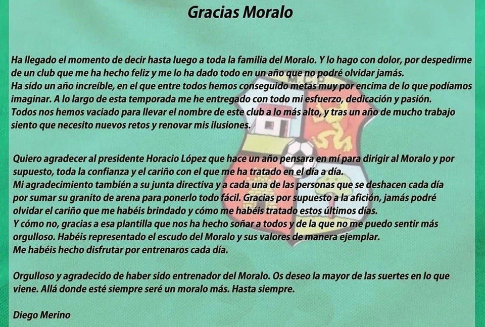 Para terminar, Merino asegura estar orgulloso y agradecido de haber sido entrenador del Moralo, deseando «la mayor de las suertes en lo que viene» y asegurando que será «un moralo más» allá donde esté.
