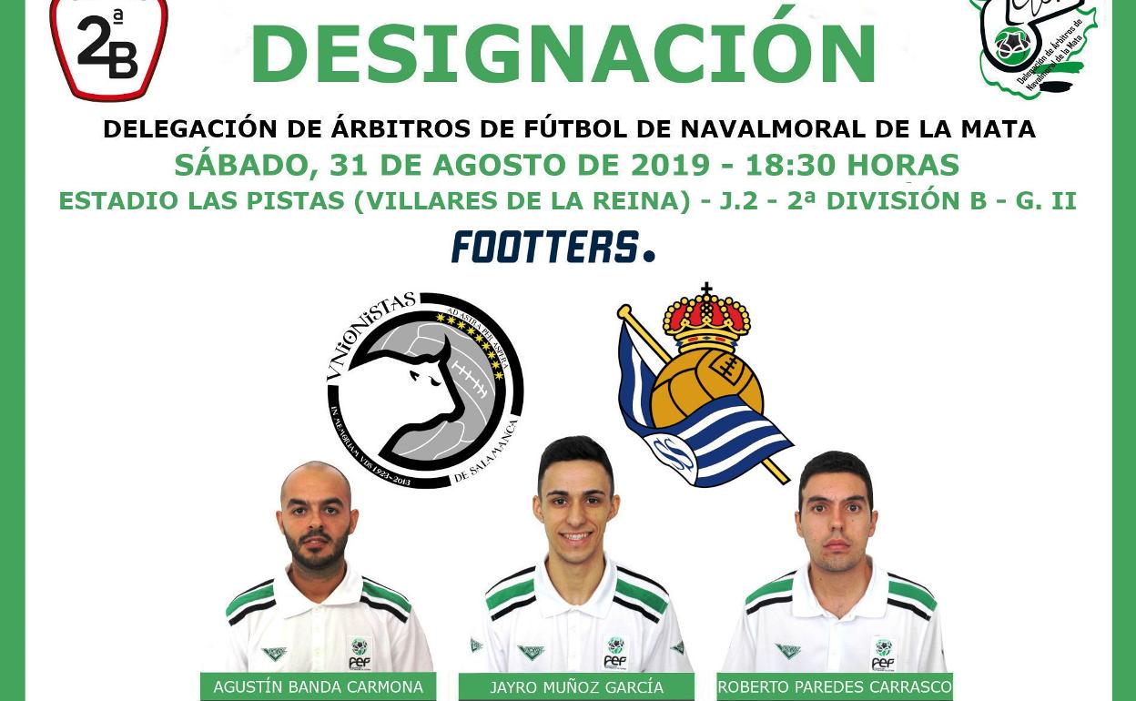 Unionistas de Salamanca y Real Sociedad B protagonizarán el sábado el primer partido que arbitrará en su nueva categoría, Segunda División B, el joven colegiado moralo Jayro Muñoz García. Será a partir de las 18.30 h. en el estadio Las Pistas, de Villares de la Reina, y se podrá ver por televisión a través de Footters.