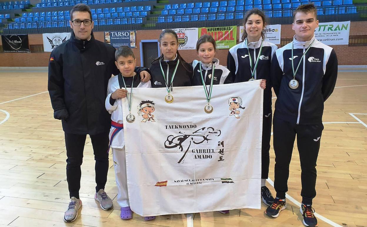 La escuela de taekwondo Gabriel Amado hizo pleno en el Campeonato de Extremadura disputado en la mañana del domingo en el pabellón del Molinillo al conseguir medallas sus cinco representantes, entre más de cien competidores.