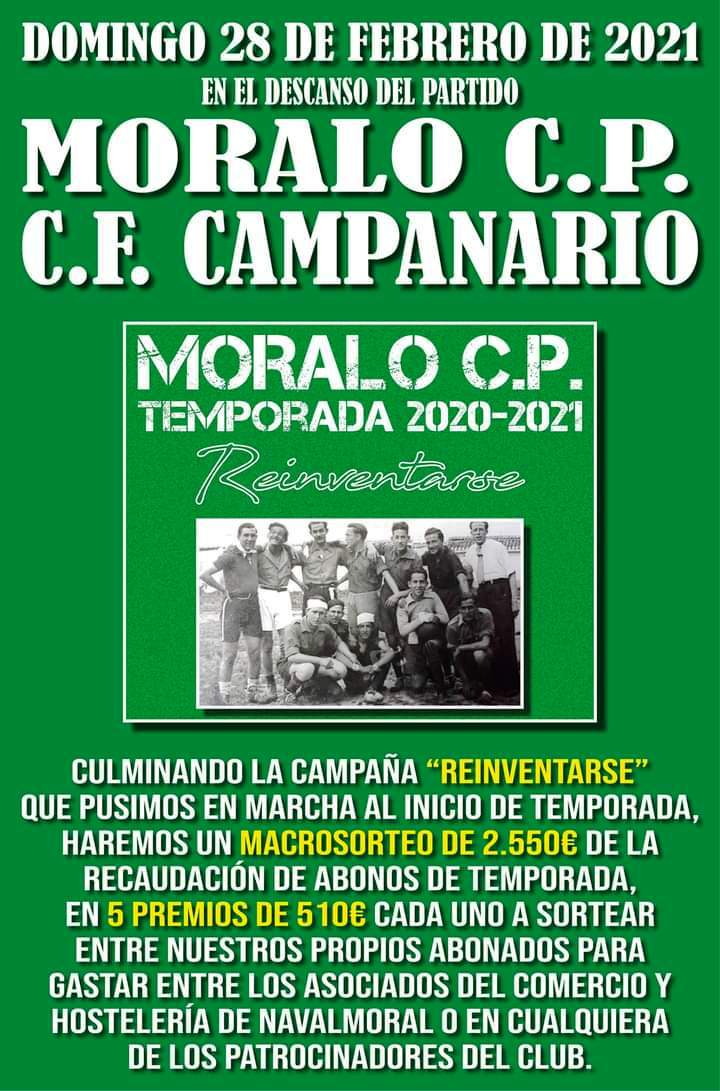 Así anuncia el Moralo la iniciativa que llevará a cabo el próximo 28 de febrero, al sortear entre sus abonados cinco premios de 510 euros cada uno en el descanso del partido que jugará en el campo municipal de deportes ante el Campanario, culminando la campaña 'Reinventarse'. En total, 2.550 euros.