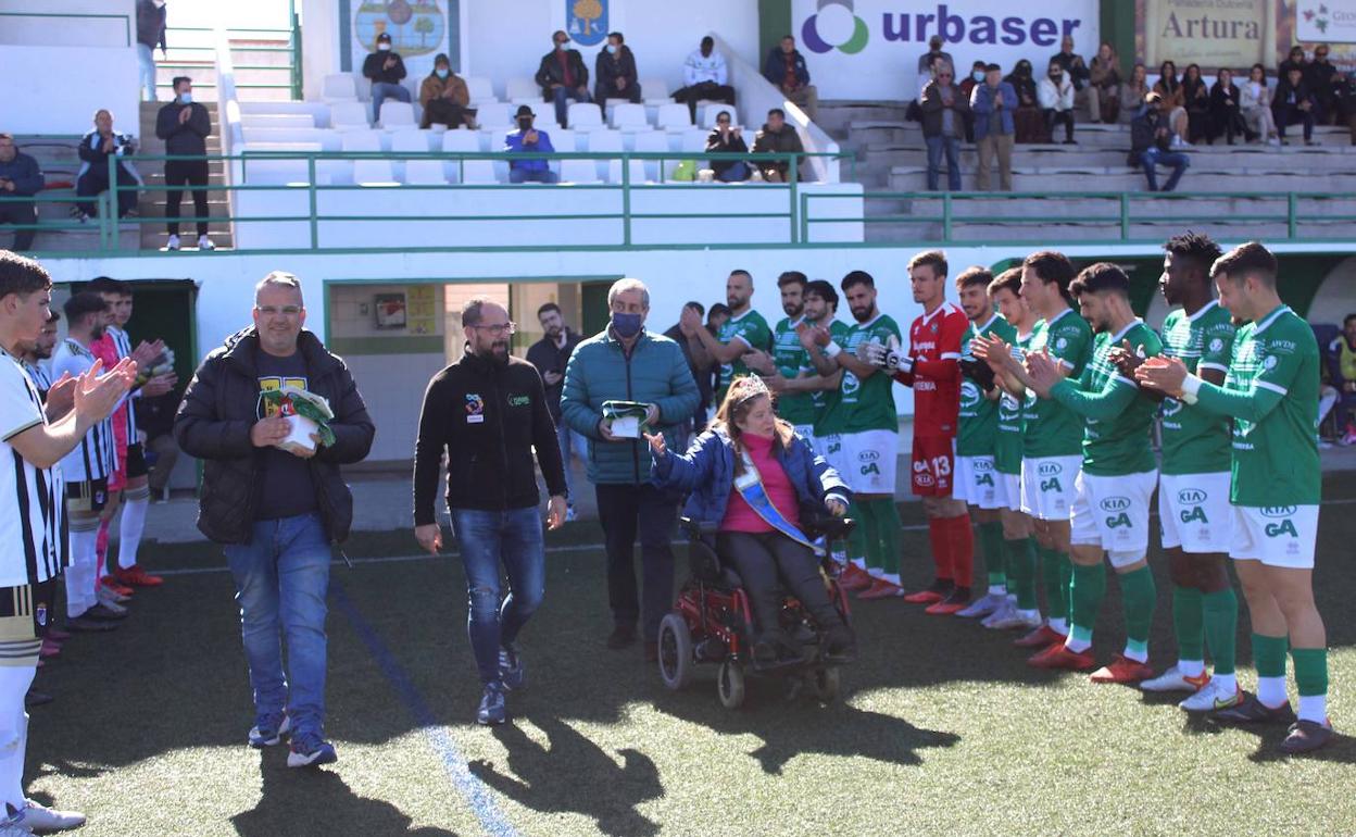 En el partido se homenajeó a las peñas del Carnavalmoral, acompañadas por la reina adulta de la fiesta, Cristina Carrasco