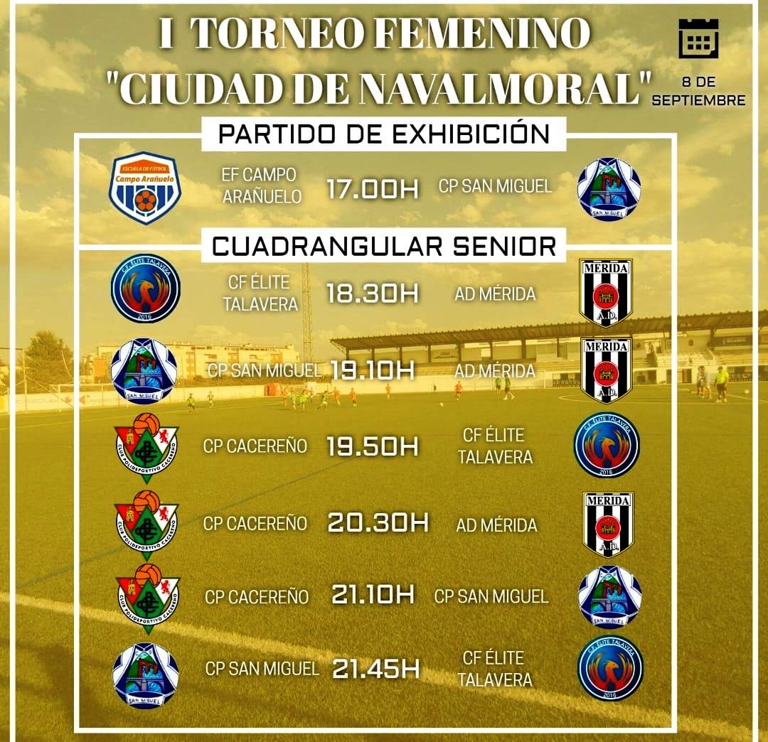 Será a partir de las cinco, con entrada gratuita. A esa hora jugarán un partido de exhibición la EF Campo Arañuelo y el CP San Miguel, para iniciarse a continuación un torneo cuadrangular senior entre el CF Élite Talavera, AD Mérida, CP Cacereño y CP San Miguel, en encuentros de 40 minutos que se prolongarán hasta cerca de las diez y media de la noche.