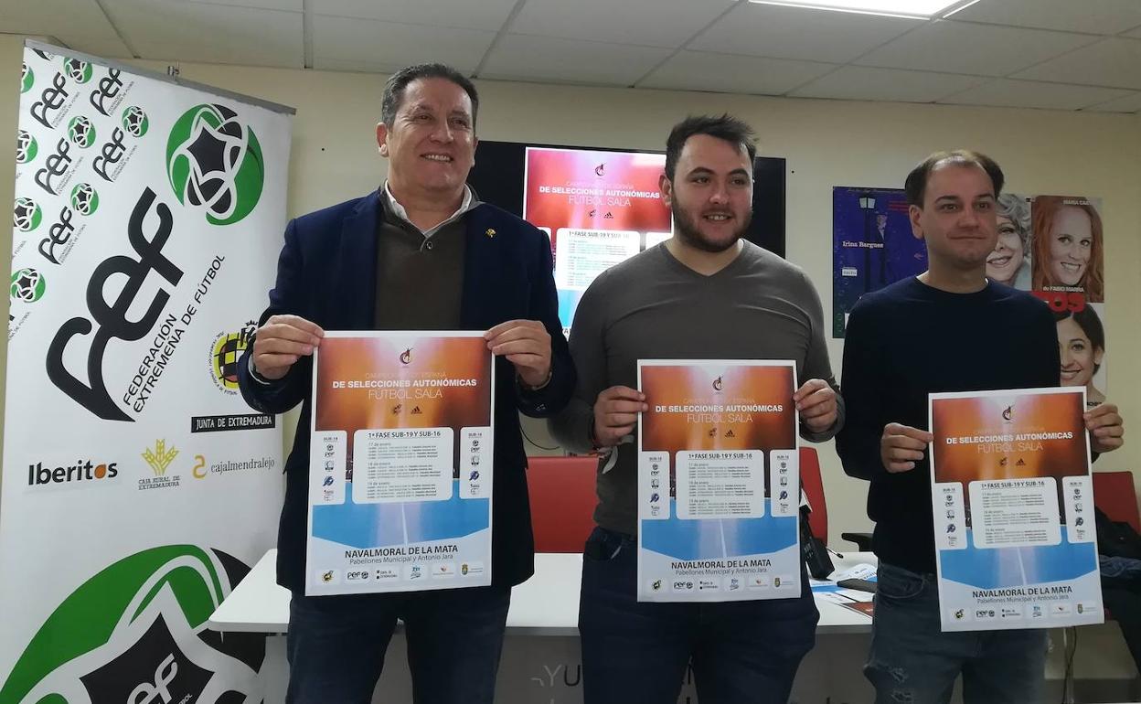 Juan Carlos Jiménez y Pablo López, en representación de la Federación Extremeña de Fútbol, y el concejal de Deportes, Josema Encinas, han ofrecido detalles de la fase de sector del Campeonato de España de selecciones autonómicas de fútbol-sala sub-16 y sub-19 que se disputará entre el viernes y el domingo en el pabellón municipal y el Antonio Jara. Tomarán parte combinados de Galicia, País Vasco y Melilla, además de la selección extremeña, de la que forman parte jugadores de Navalmoral FS y Almaraz. Más información en HOY.