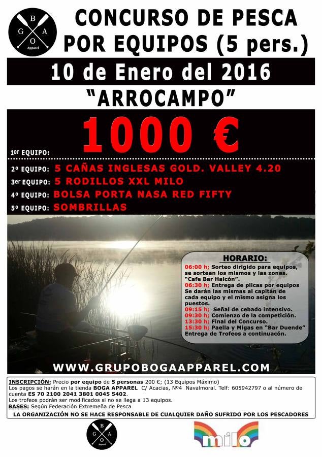 Se trata de un concurso por equipos, compuestos por cinco personas, hasta un máximo de trece, que en algún caso formarán pecadores de primer nivel en busca de los importantes premios con los que está dotado. Los ganadores se llevarán 1.000 euros. A partir de ahí se entregarán cañas inglesas gold, rodillos xxl Milo, bolsa porta nasa o sombrillas.