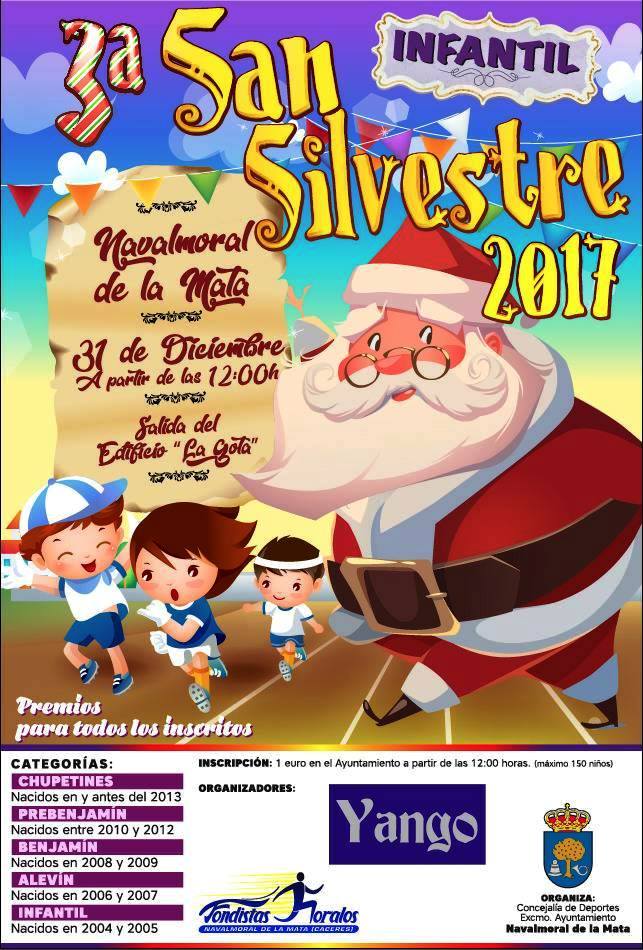 Hasta 150 corredores de categorías chupetines a infantil tomarán parte el último día del año en la 3ª carrera de San Silvestre que organiza la tienda Yango, con la colaboración de la concejalía de Deportes y Fondistas Moralos. Se iniciará a las doce desde el centro cultural La Gota, si bien hay que inscribirse previamente en la plaza de España abonando 1 euro.