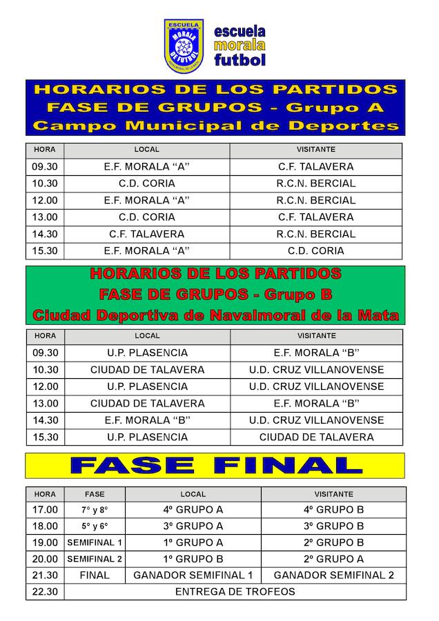 Los ocho conjuntos participantes se dividen en dos grupos. En el A están la Escuela Morala A, el CD Coria, el CF Talavera y el Bercial, de Getafe. En el B, U. P. Plasencia, Ciudad de Talavera, La Cruz Villanovense y Escuela Morala B.