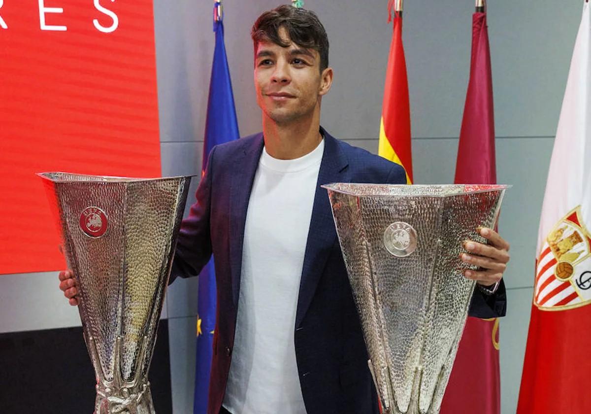 Compareció en el Sánchez-Pizjuán rodeado de su familia y los dos trofeos conseguidos visiblemente emocionado. «Cuando vine al Sevilla creo que tomé la mejor decisión de mi vida», destacó durante su discurso.