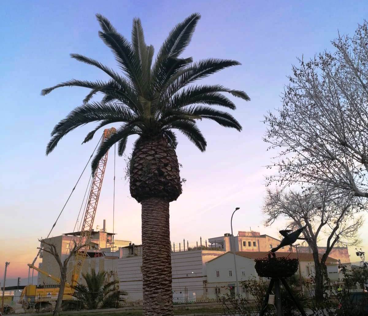 Esta noche he sacado a Floyd a dar su paseo y he pasado por la zona en cuestión. Allí están enjaulados los árboles con su chal puesto, y la zona de juegos enlutada esperando su mutilación. Y he vuelto a ver a nuestro más vivo símbolo de resistencia: la única palmera sana de la zona que queda en la plazuela de la cigüeña, que ha sobrevivido al pulgón rojo, y hoy se yergue lozana, a la espera de su futuro.