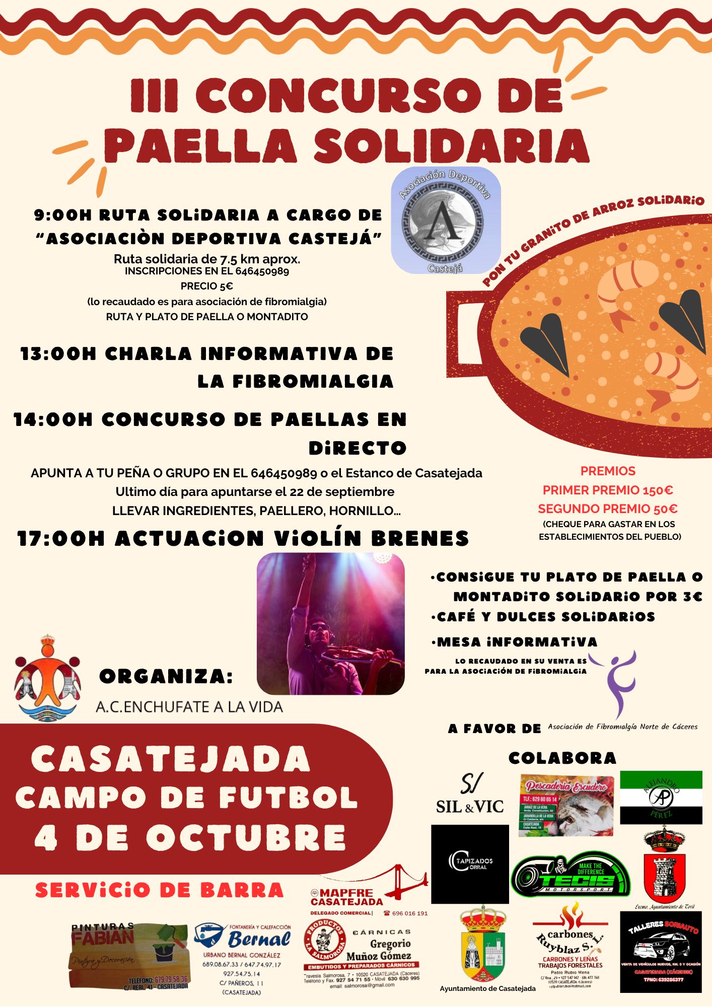 El sábado la cita será en Casatejada, en el campo de fútbol, con la tercera edición del Concurso de Paella Solidaria, promovido por la asociación cultural Enchúfate a la Vida con la colaboración del Ayuntamiento y de varias entidades y establecimientos locales.