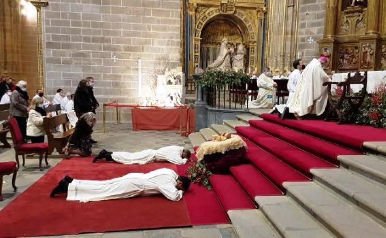 Los dos posiblemente comenzarán a realizar este mismo fin de semana muchas de las funciones encomendadas a los sacerdotes tras ser ordenados ayer diáconos con el respaldo de sus familias. Sus hijos leyeron en la ceremonia y se ocuparon de las ofrendas; sus mujeres colaboraron en el rito de ordenación colocándoles las dalmáticas tras las estolas, con las que completaron la túnica blanca que vestían desde el inicio de la celebración. Un acto en el que participaron algunos sacerdotes de la Diócesis y familiares y amigos de los protagonistas, menos de los que podrían haber estado por las restricciones a las que obliga la covid.
