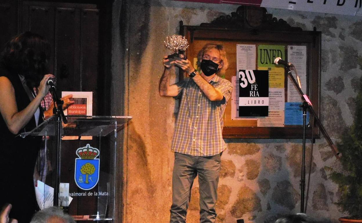 Muy emocionado, casi entre lágrimas, recogió Eduardo Moreno Alarcón el galardón que le acredita como ganador del XIV Premio de Novela Corta 'Encina de Plata', que se entregó en la noche del viernes en la zona peatonal del Jardincillo dentro de las actividades de la Feria del Libro 2020.
