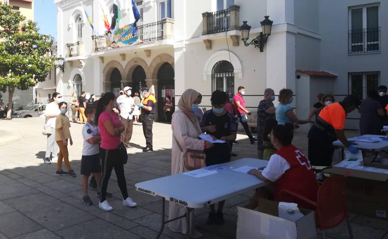 En la misma se han instalado tres mesas, atendidas por voluntarios de Protección Civil y Cruz Roja, para entregar a los menores de 14 años un pack con cinco mascarillas infantiles y tres quirúrgicas adaptadas a su edad.