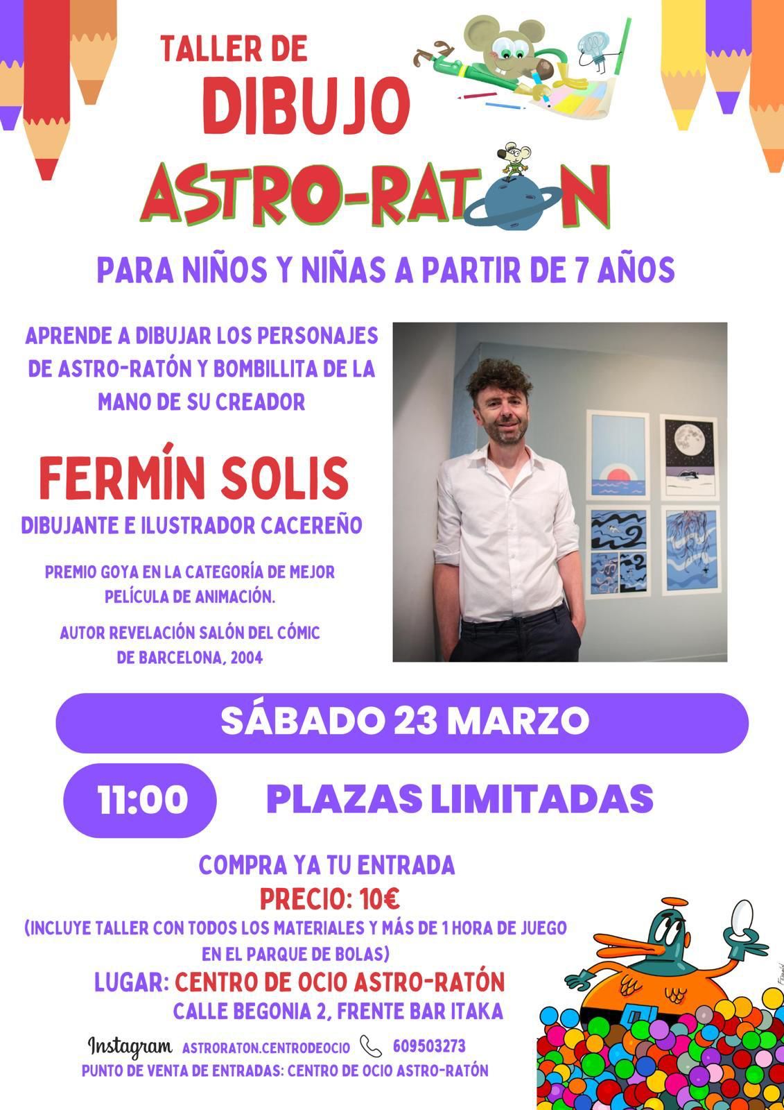 El centro de ocio Astro-Ratón acogerá un taller dirigido a niños a partir de siete años, en el que aprenderán a dibujar a los personajes del cómic 'Astro-Ratón y Bombillita'. Será el día 23, a cargo del propio creador del cómic, el dibujante e ilustrador extremeño Fermín Solís.