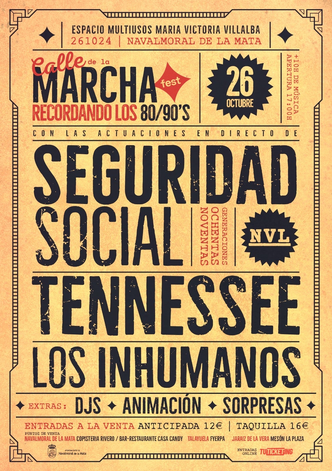 El edificio multiusos se llenará de nuevo de música en la tarde-noche del sábado 26 con el IV Festival Calle de la Marcha, en el que actuarán los grupos Tennesse (18.30 h.), Seguridad Social (21.00 h.) y Los Inhumanos (23.30 h.) para recordar y hacer bailar canciones de los años 80 y 90.