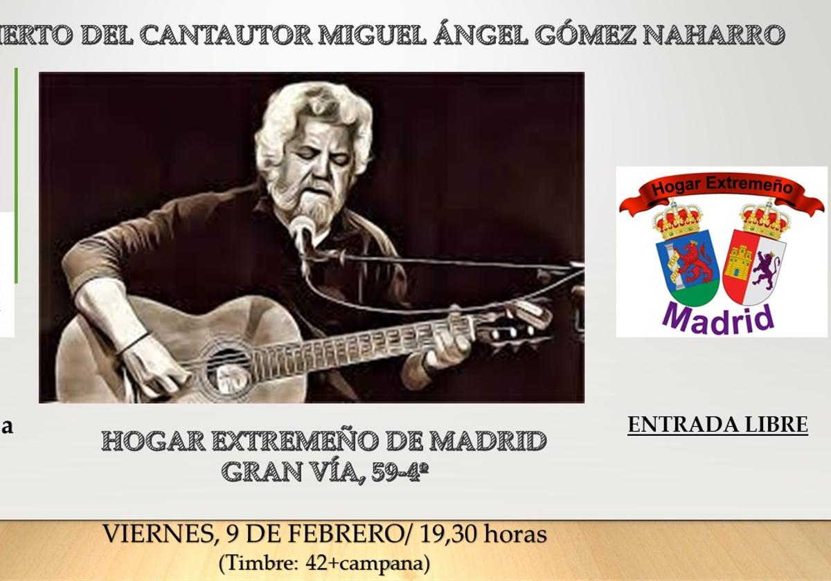 El cantautor Miguel Ángel Gómez Naharro, natural de Casas de Miravete y afincado desde hace años en Mérida, repasará su dilatada trayectoria musical en el recital que ofrecerá en la tarde del viernes en el Hogar Extremeño de Gran Vía, en Madrid, dentro de la amplia y variada programación cultural del centro. En este caso cuenta con la colaboración de la Junta de Extremadura.