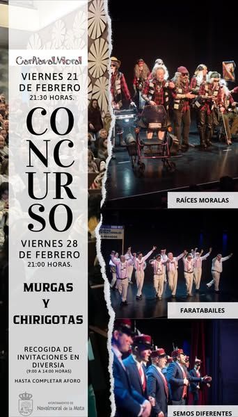 El Ayuntamiento abrirá el jueves la recogida de invitaciones para asistir a los dos pases que tendrá este año el Concurso de Murgas y Chirigotas del Carnaval, los viernes 21 y 28 en el Teatro del Mercado, con la participación de Faratabailes, Semos Diferentes y Raíces Moralas.