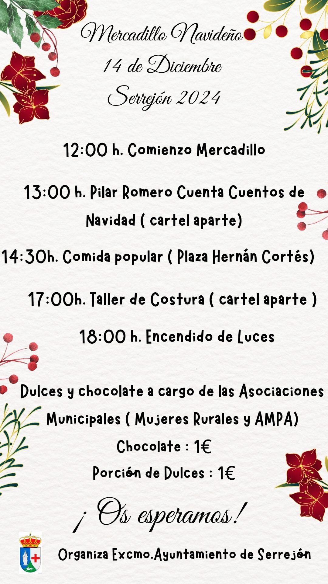 Los puestos se abrirán a las 12.00 h., para continuar con un cuenta cuentos de Navidad a cargo de Pilar Romero, una comida popular de la plaza Hernán Cortes y un taller de costura impartido por el artesano local Julián Sánchez, de 100Colores100, presente en distintos mercadillos y eventos populares. Las luces navideñas se encenderán a las 18.00 h.