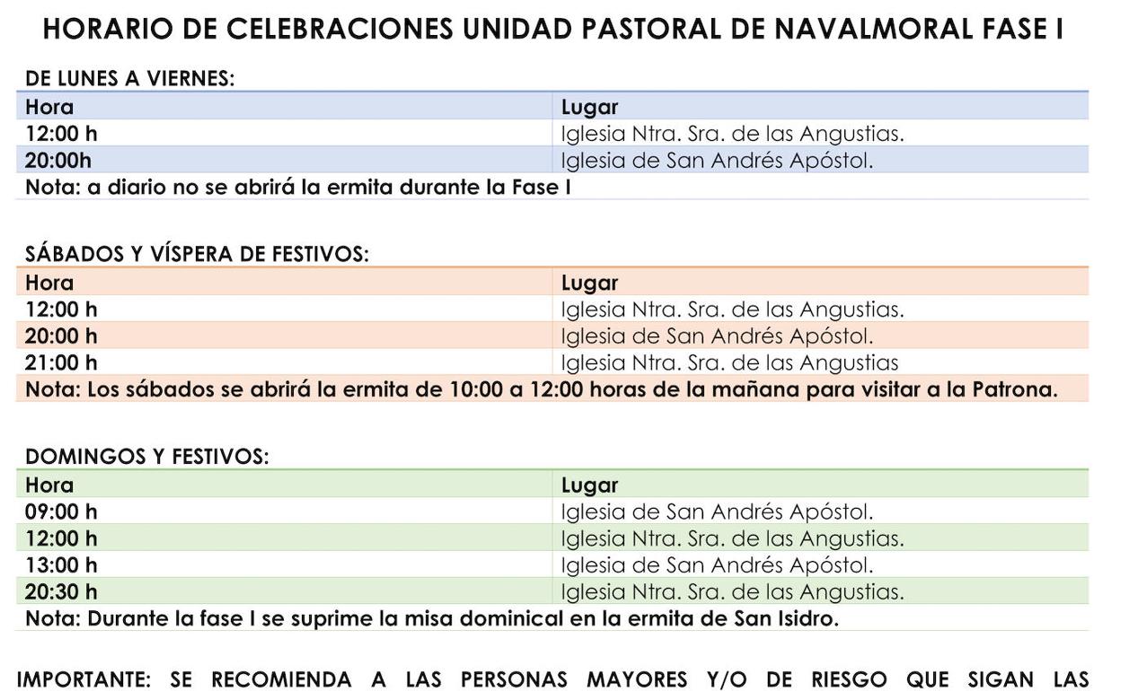 El Consejo Parroquial de la comunidad cristiana de Navalmoral anuncia que el miércoles 13 se reanudarán las celebraciones litúrgicas en las iglesias locales, interrumpidas desde la instauración del estado de alarma. La primera cita será a las doce del mediodía en la iglesia de las Angustias, siguiendo todas las directrices establecidas por las autoridades sanitarias.