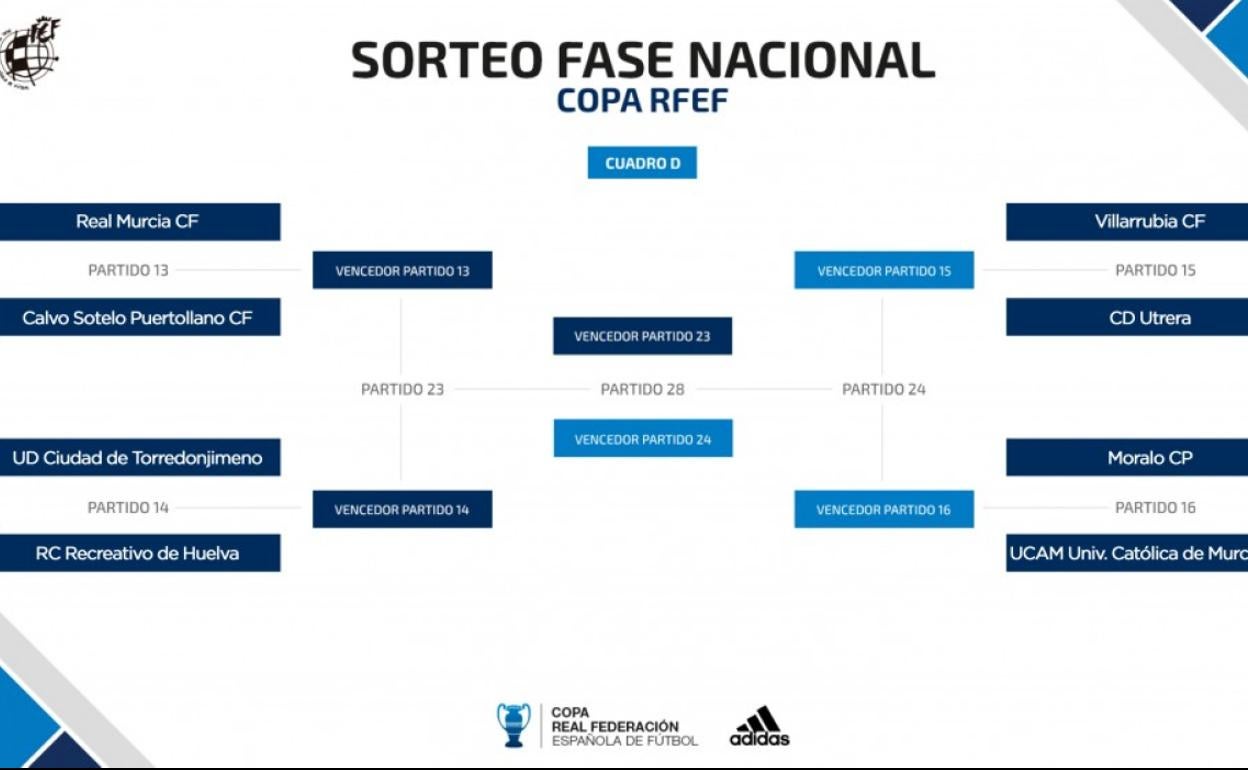 Esos 32 equipos han quedado encuadrados en cuatro grupos, de ocho cada uno. El Moralo está en el D. Por su lado del cuadro figuran, además del UCAM Murcia, Villarrubia y Utrera, que se medirán entre sí. Por el otro aparecen Real Murcia–Calvo Sotelo Puertollano y Ciudad de Torredonjimeno–Recreativo de Huelva, que disputarán las otras dos eliminarías.