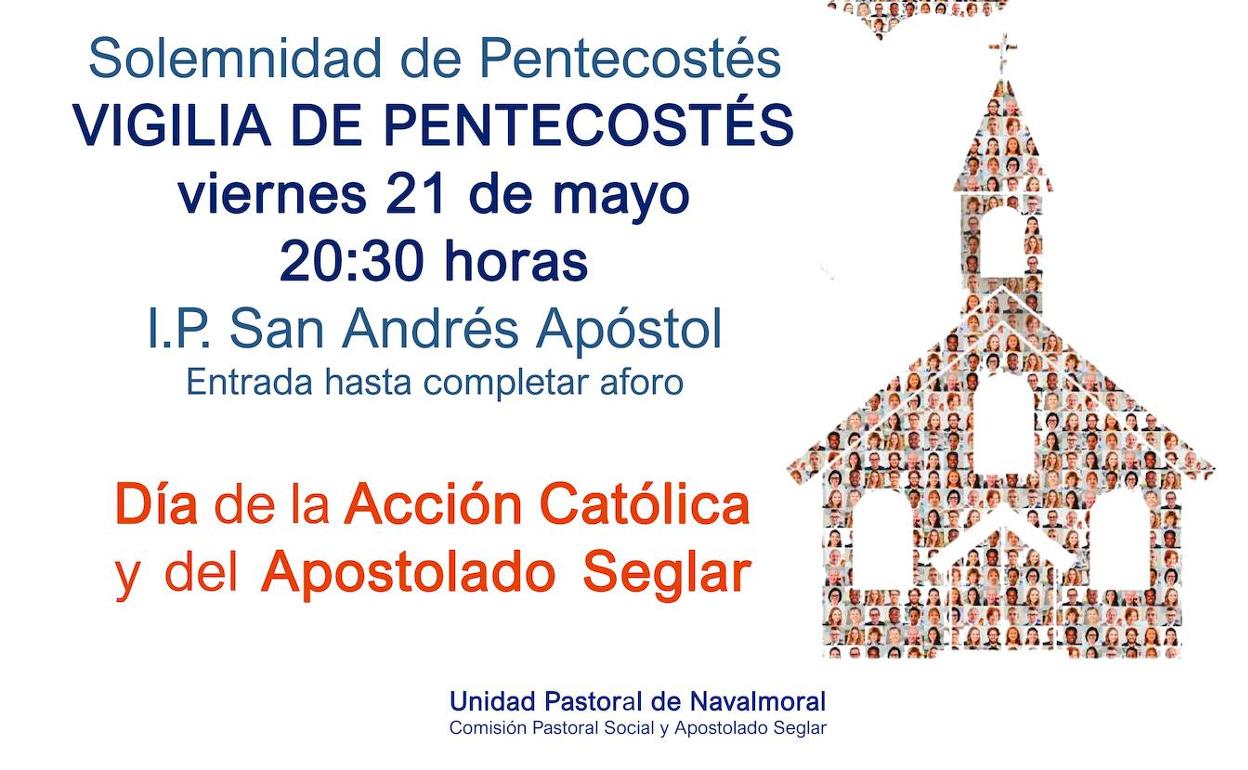 Con motivo de la solemnidad de Pentecostés, que se celebra el domingo 23 de mayo, Día de la Acción Católica y del Apostolado Seglar, la Comisión de Pastoral Social y Apostolado Seglar de la Unidad Pastoral de Navalmoral organiza la tradicional Vigilia. Será el viernes, a las 20:30 h., en la iglesia de San Andrés, en la que se darán cita todos los movimientos de laicos que trabajan en Navalmoral y están representados en el Consejo Pastoral.