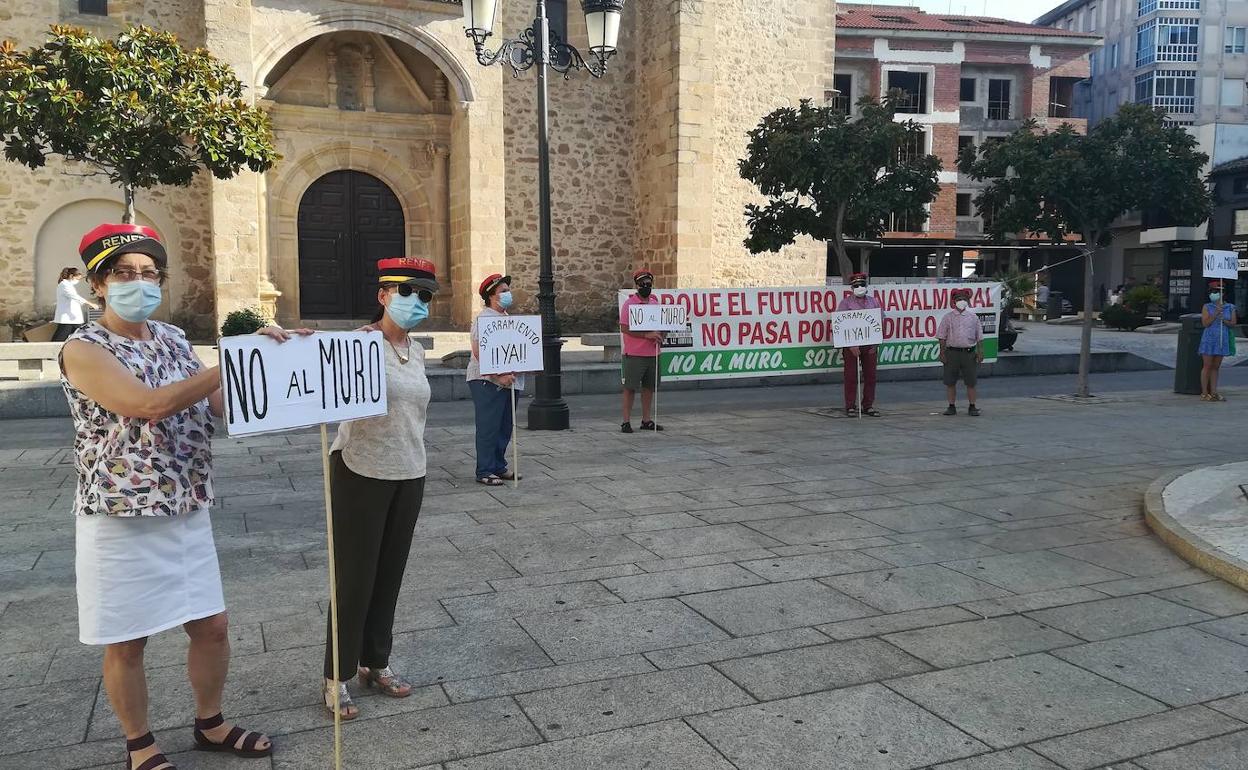 Los integrantes de la plataforma No al Muro aprovecharon el pleno que celebró el jueves la Corporación Municipal para mostrar frente al Ayuntamiento, con mascarillas y distancia social, su rechazo a la plataforma en superficie del tren de alta velocidad, dado que el procedimiento de expropiación de los terrenos ya está en marcha, instando a las administraciones local y regional para evitarlo.
