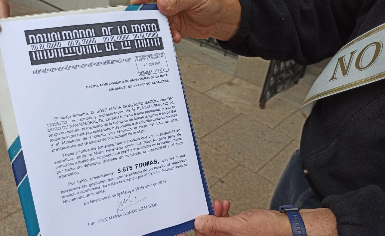 Según se dice en el escrito entregado en el Consistorio, esas firmas «dan testimonio del rechazo ciudadano mayoritario a la solución tomada por Adif y el Ministerio de Fomento con respecto al paso del tren de altas prestaciones por la ciudad de Navalmoral».