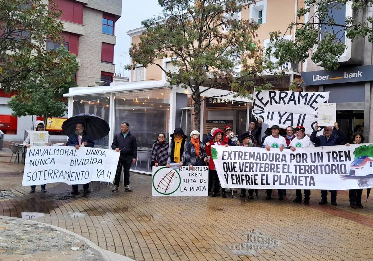 Más de cinco años después, ya que la primera vez fue en octubre del 2018, y a pesar de la lluvia, un grupo de vecinos y vecinas de Navalmoral han vuelto a concentrarse, en este caso en el Jardincillo, para pedir la recuperación del tren Ruta de la Plata, uniéndose a la movilización convocada en distintos puntos de España.