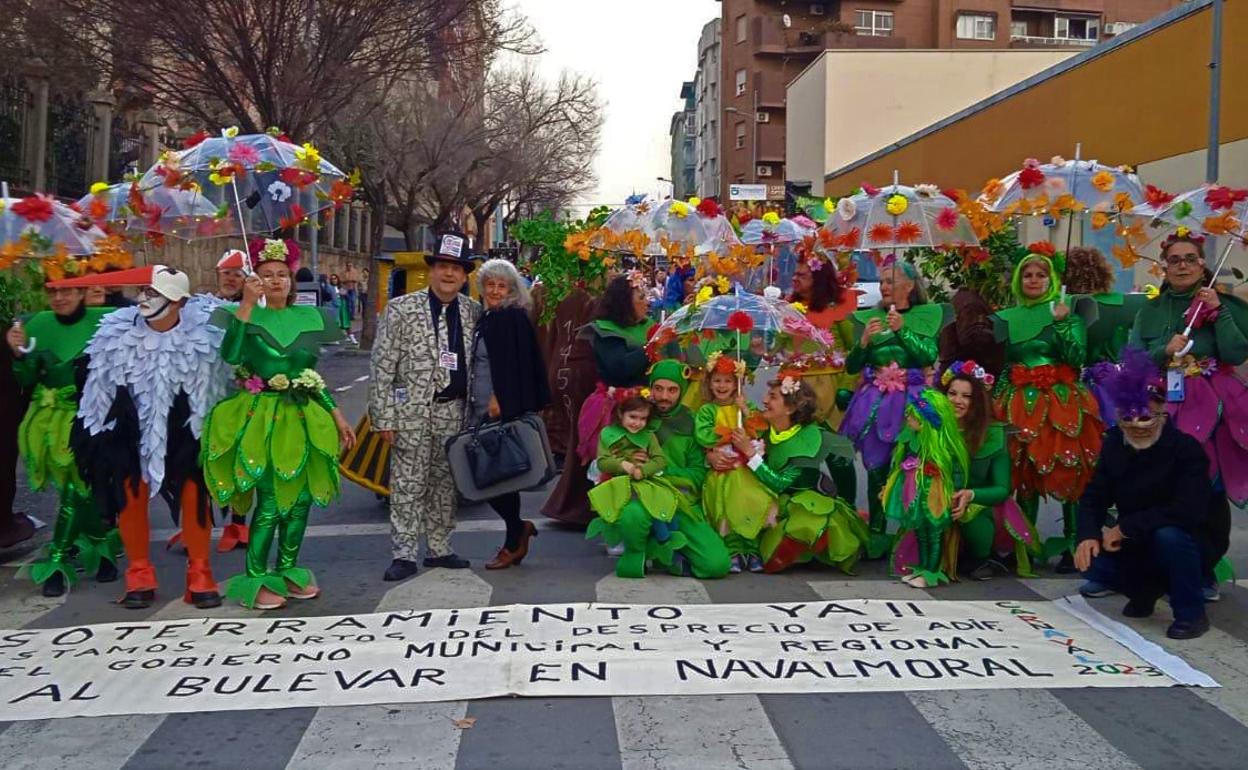 En el pasacalles del lunes 20 la plataforma participó con una representación de un 'tren extremeño' y disfraces de árboles, plantas y aves en referencia al bulevar sobre las vías del tren que se reivindica.