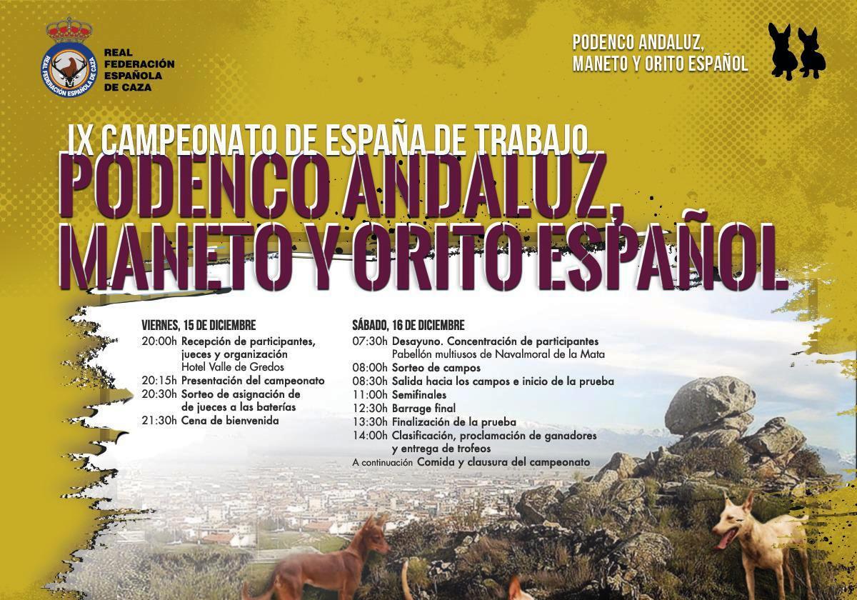 Los campeonatos de trabajo para las razas de podenco, maneto y orito español consisten en extrapolar un día de caza a las normas de una competición. Durante estas pruebas, los participantes no pueden portar armas de fuego, dejando que los perros cacen como lo hacen habitualmente.