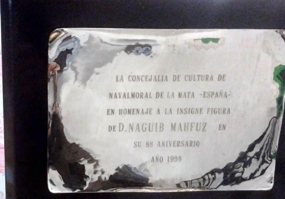 Se trata de la placa que entregó en su día la concejalía de Cultura al escritor Naguib Mahfuz en su 88 cumpleaños