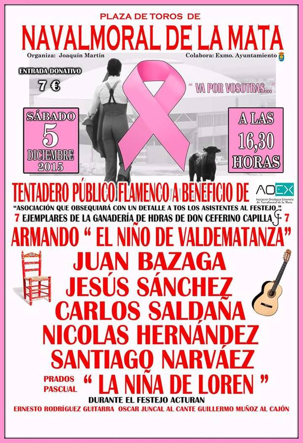 El edificio multiusos María Victoria Villalba plaza de toros en los ambientes taurinos- será escenario el sábado 5 de diciembre de una actividad benéfica que unirá el mundo del toreo y el flamenco. Un tentadero público flamenco cuya recaudación se destinará a la Asociación Oncológica Extremeña, AOEX. De ahí el lazo rosa que aparece en el cartel y la descriptiva frase Va por vosotras en alusión a las afectadas por cáncer de mama.