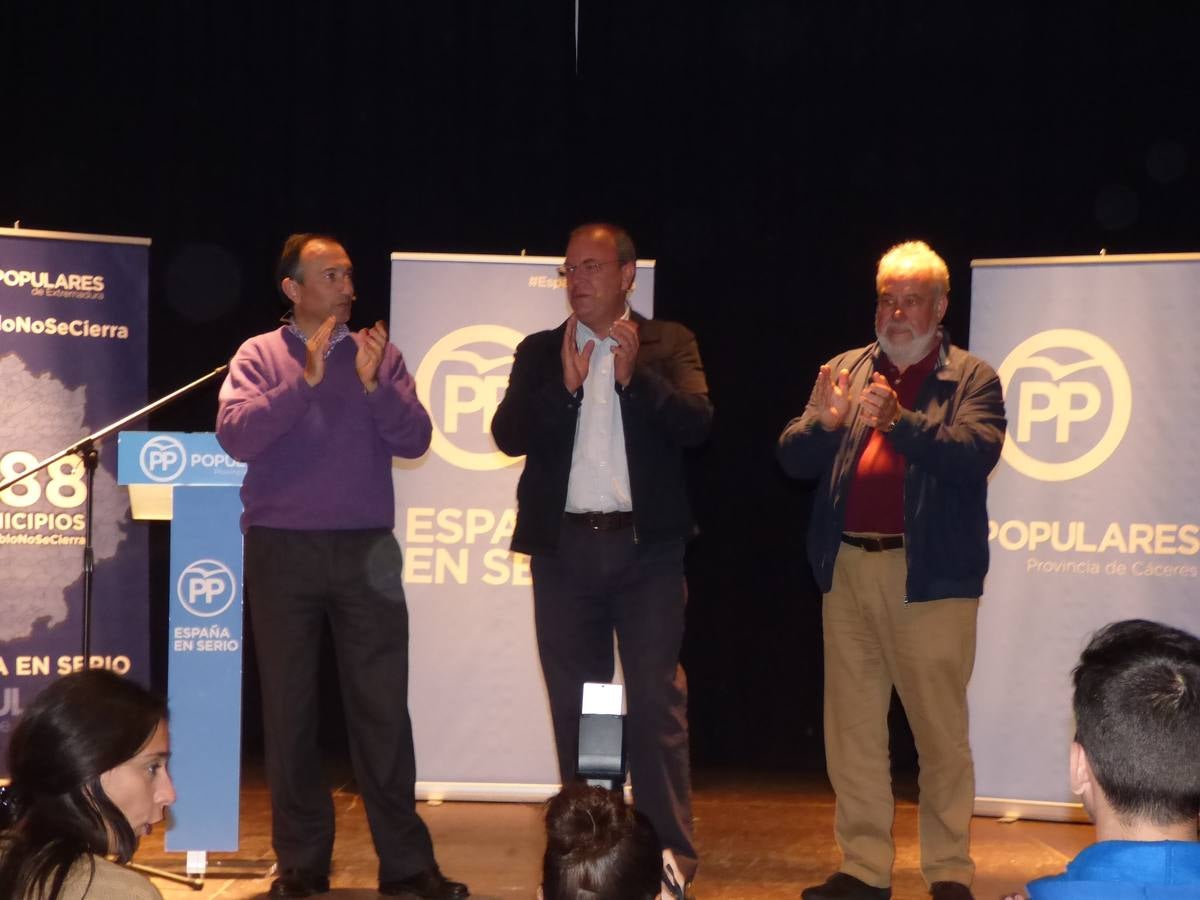 El líder regional popular, José Antonio Monago, acompaña a Laureano León y Rafael Mateos, candidatos al Senado, en un acto celebrado en la casa de la cultura