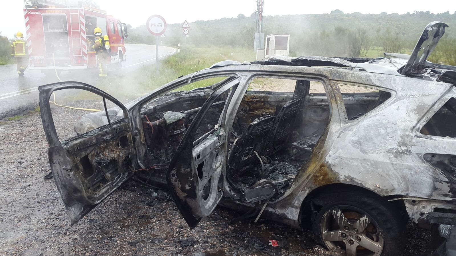 Un vehículo ha salido ardiendo en la tarde del martes en la autovía de Extremadura, en la salida Jaraicejo norte dirección Badajoz, hasta quedar calcinado. Al conductor le dio tiempo a salir de la autovía y sacarlo de la calzada para no poner en peligro a otros automovilistas