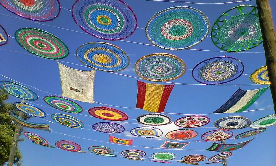 La plaza de los Caños de Millanes luce en los últimos días un vistoso sombreado elaborado por un grupo de mujeres para dar mayor vistosidad a esa parte del pueblo. Y lo han conseguido, dado que el resultado no puede ser más llamativo por su colorido y la variedad de los motivos que han confeccionado con bolsas de plástico tejidas. De hecho la intención es colocar más en la subida a la plaza y en la propia plaza como motivo ornamental, pero también para proporcionar sombra a las actividades que se realicen en verano