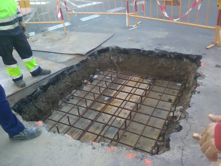 Trabajadores municipales han cubierto ya el pozo que apareció días atrás en la confluencia de la calle García de Paredes con la Ronda Sur al ceder una parte del pavimento. Primero lleva una plancha de madera, después un forjado de hierro y finalmente una losa de hormigón, además del pavimento que se echará, para evitar que vuelva a suceder algo parecido.