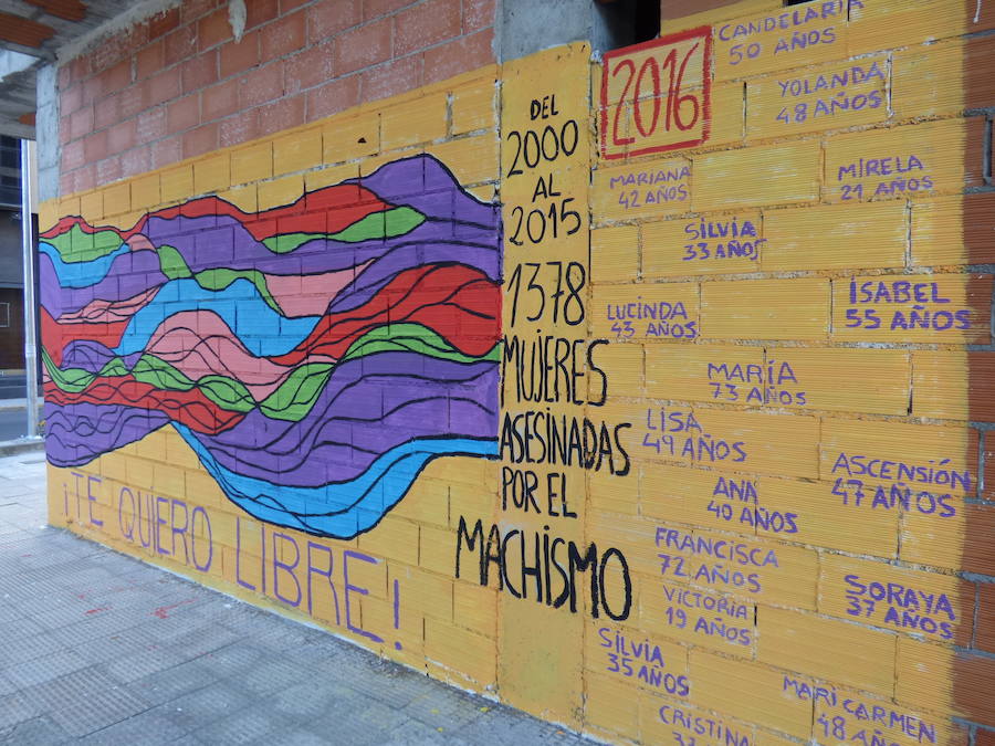 En los últimos días está llamando mucho la atención el mural que han pintado el colectivo El Tren de la Libertad y la asociación Amatista en un bloque de viviendas a medio construir en las inmediaciones de la casa sindical, en homenaje a las mujeres que han sido asesinadas por sus parejas o ex-parejas. En 2016 son una veintena, de las que figuran su nombre y su edad. 'Te quiero libre' es el lema de ese mural