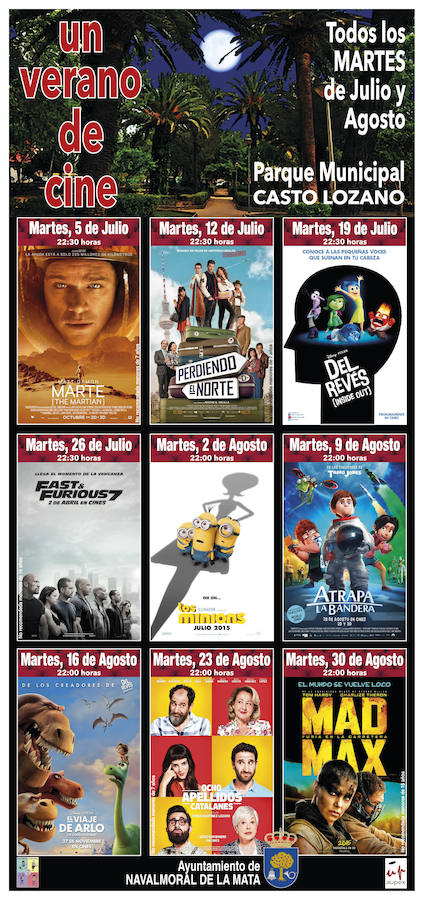Hasta nueve películas se proyectarán a lo largo de julio y agosto en el Parque Municipal Casto Lozano, a partir de las diez y media de la noche. La primera proyección corresponderá al largometraje Marte, siguiéndola otros títulos como Perdiendo el norte, De revés, Fast & Furious 7, Los Minions, Atrapa la bandera, El viaje de Arlo, Ocho apellidos catalanes y Mad max, con el que finalizará este ciclo, ya el 30 de agosto.