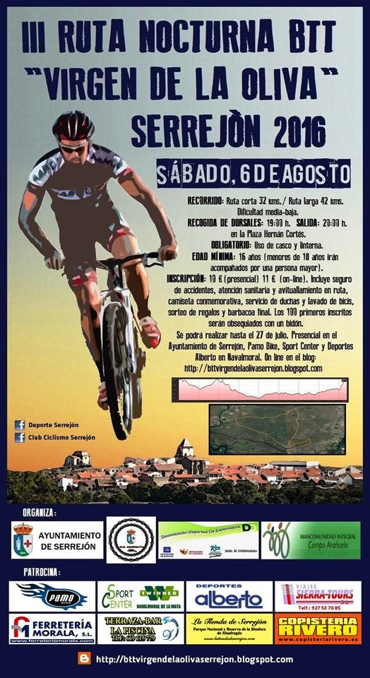 El plazo para inscribirse termina el jueves 28. Puede hacerse de forma presencial en el Ayuntamiento organizador o en Sport Center y Pamo Bike, de Navalmoral, abonando 10 euros, y on-line, con un coste de 11, a través del blog http://bttvirgendelaolivaserrejon.blogspot.com. Es obligatorio el uso de casco y linterna, siendo la edad mínima para participar de 16 años.