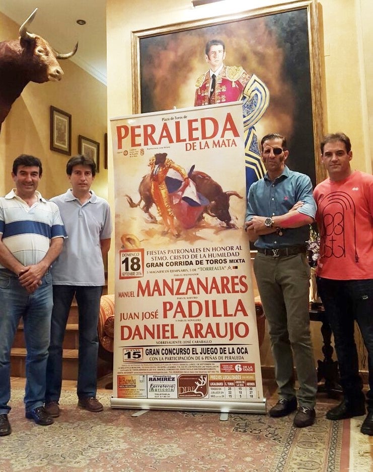 El conocido matador Juan José Padilla, el rejoneador Manuel Manzanares y el novillero Daniel Araujo forman la terna que actuará el 18 de septiembre en Peraleda de la Mata, en una corrida de primer nivel con motivo de las Fiestas del Cristo, que organizan el empresario taurino Carmelo García y el moralo, también empresario, Jorge Serrano.