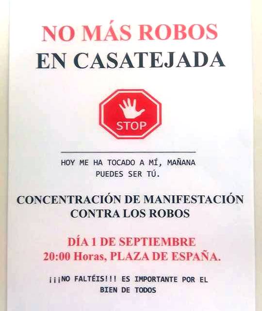 A las ocho de la tarde del jueves están convocados los vecinos de Casatejada a una concentración en la plaza de España para mostrar su rechazo a los robos que vienen sufriendo de manera reiterada en los últimos meses y, sobre todo, para pedir que se adopten medidas para evitarlos. La movilización la han promovido varios vecinos a título particular, cansados de la situación que se está viviendo. 'No más robos en Casatejada. Hoy me ha tocado a mí, mañana puedes ser tú', es su lema.